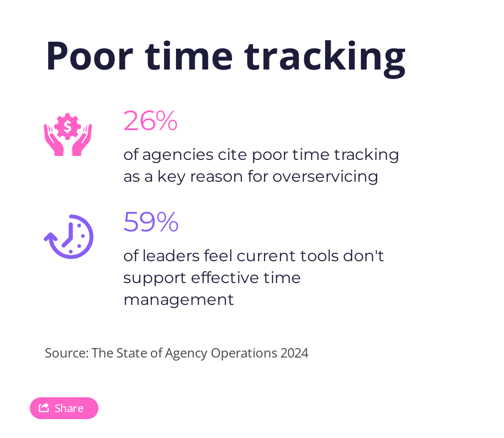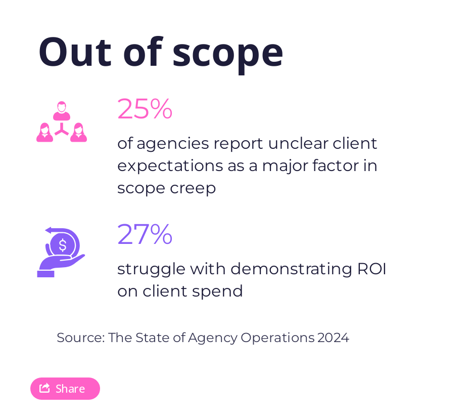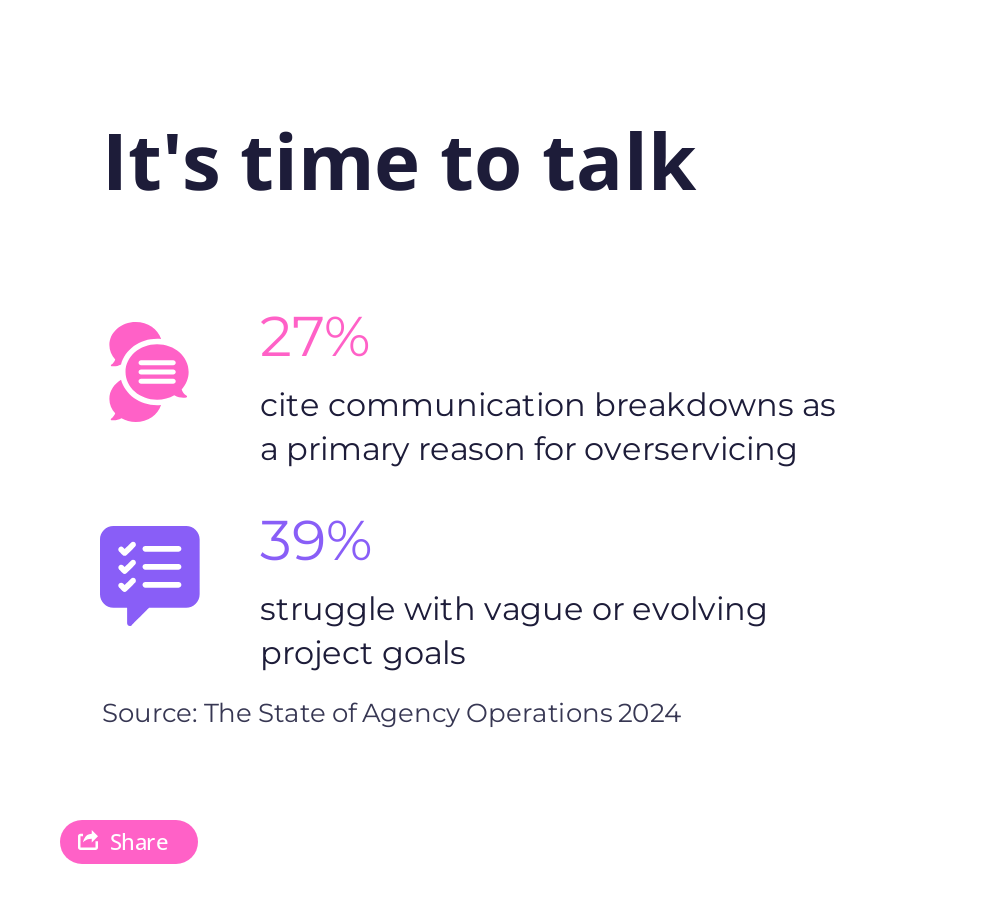 Fear of losing clients and the drive to keep them happy often leads agencies down a dangerous path of overservicing. Nearly 31% of agencies are caught in this cycle, offering more than what’s initially agreed upon, sometimes on a weekly basis.