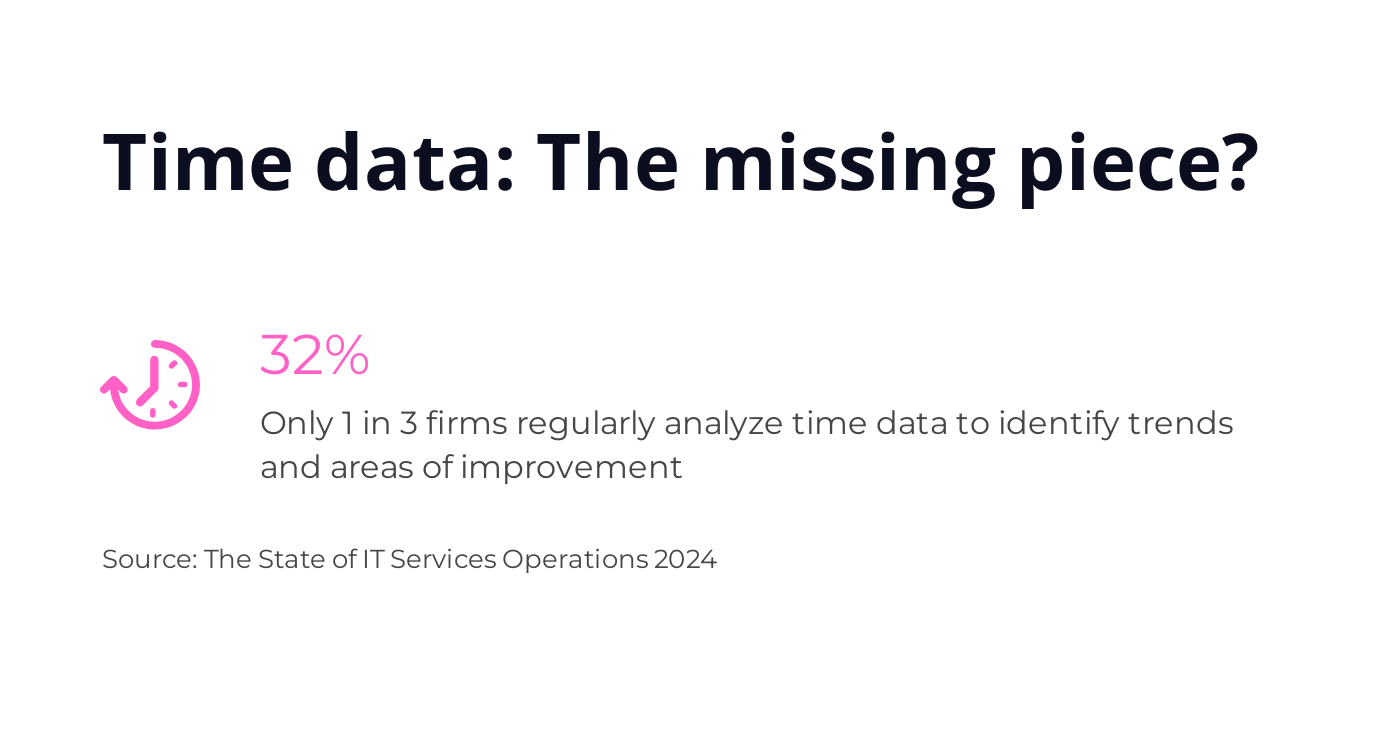 Solution: One of the biggest issues IT services firms face is having time data on different types of work (e.g. one off projects, ongoing retainers, bugs or support issues, etc.) located in different places. This makes it difficult to get one view of what your teams are doing, and where your time and budget is being spent.